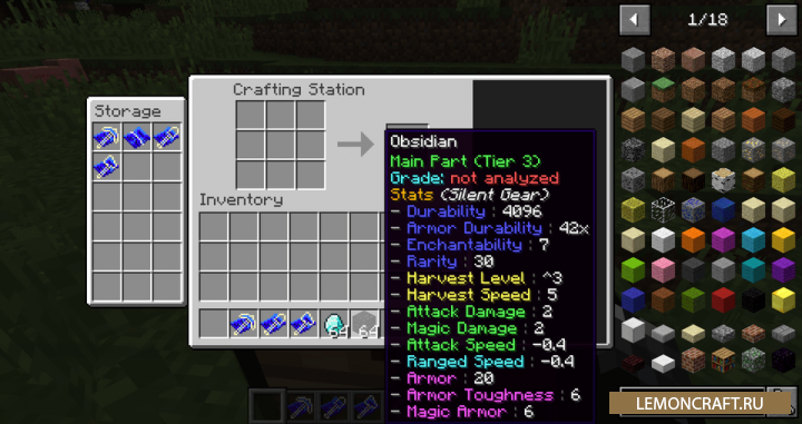 Мод на улучшенный крафт оружия и инструментов Silent Gear добавляет в игру систему модульного создания оружия, брони и инструментов из уже существующих материалов, а так же добавляет свои материалы. Путем комбинирования материалов вы сможете получить более продвинутый результат чем при обычном крафте. Инструменты, оружия и броня созданные по новой методике будут иметь особые свойства и улучшенные характеристики.